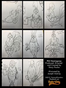 It's a dream come true to be able to afford to just go crazy with your ideas. I created 'Phil' to be a mascot. I wanted to be radically funny. Being someone who studied film and animation. It super fun to build a charter around the different segment shows I want on CVVibe. Here are some of the beginning sketches of "Phil Hemingway" Produced, Directed and Created by Stacy Poulos. Illustrated by Joseph Aubrey. Joseph has dose a fantastic job bring Phil to fruition and is happy to illustrate all my nutty ideas. Of course as I work to get bigger budgets Phil will be limitedly animated.. He also has a great voice. Of course all these things cost money.
